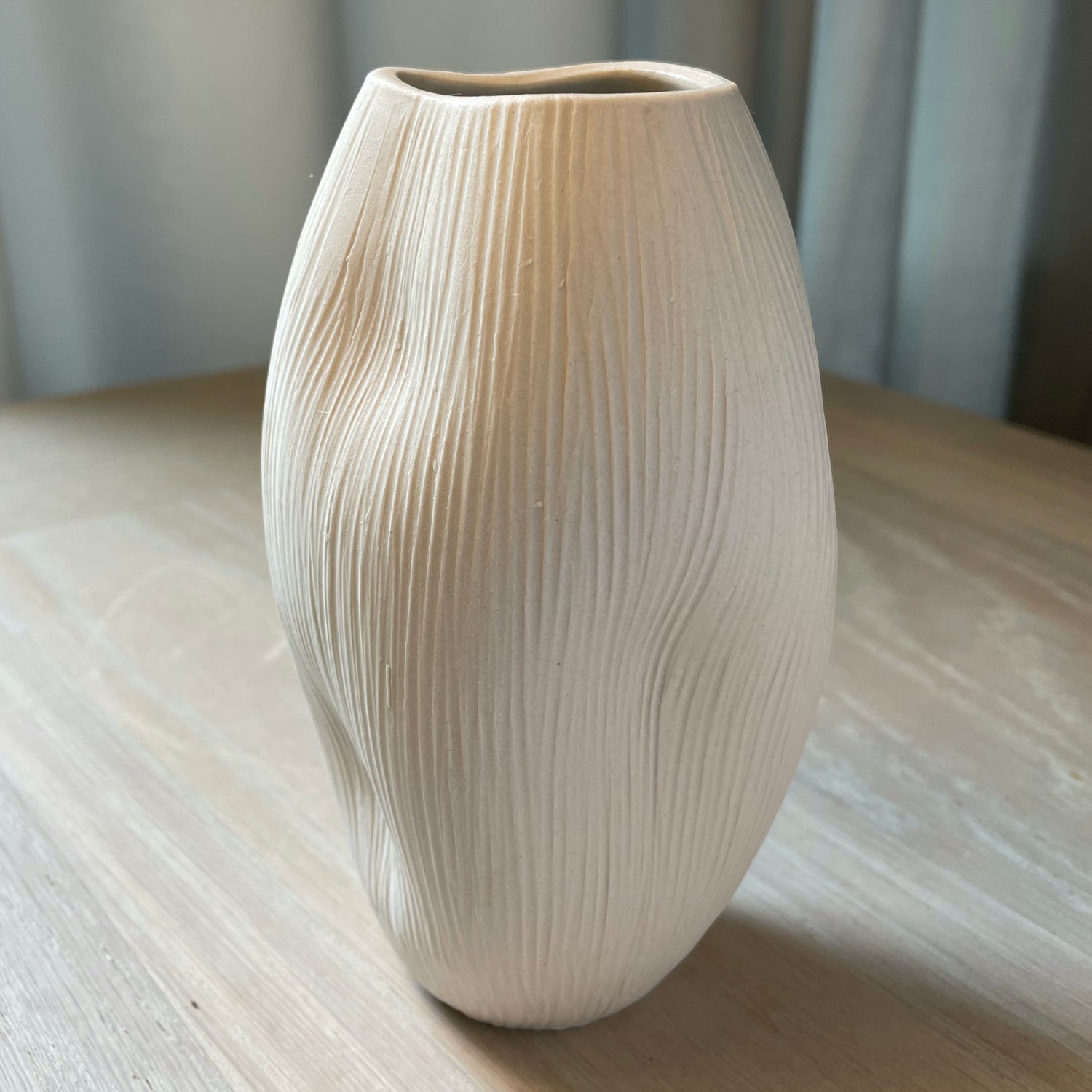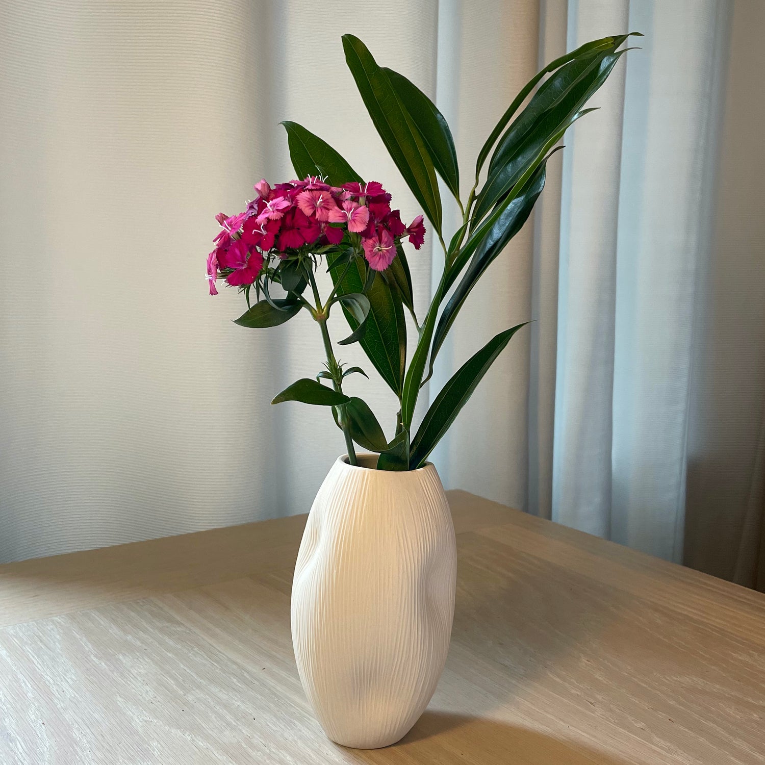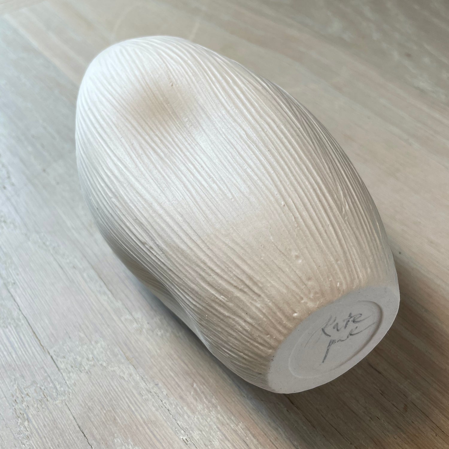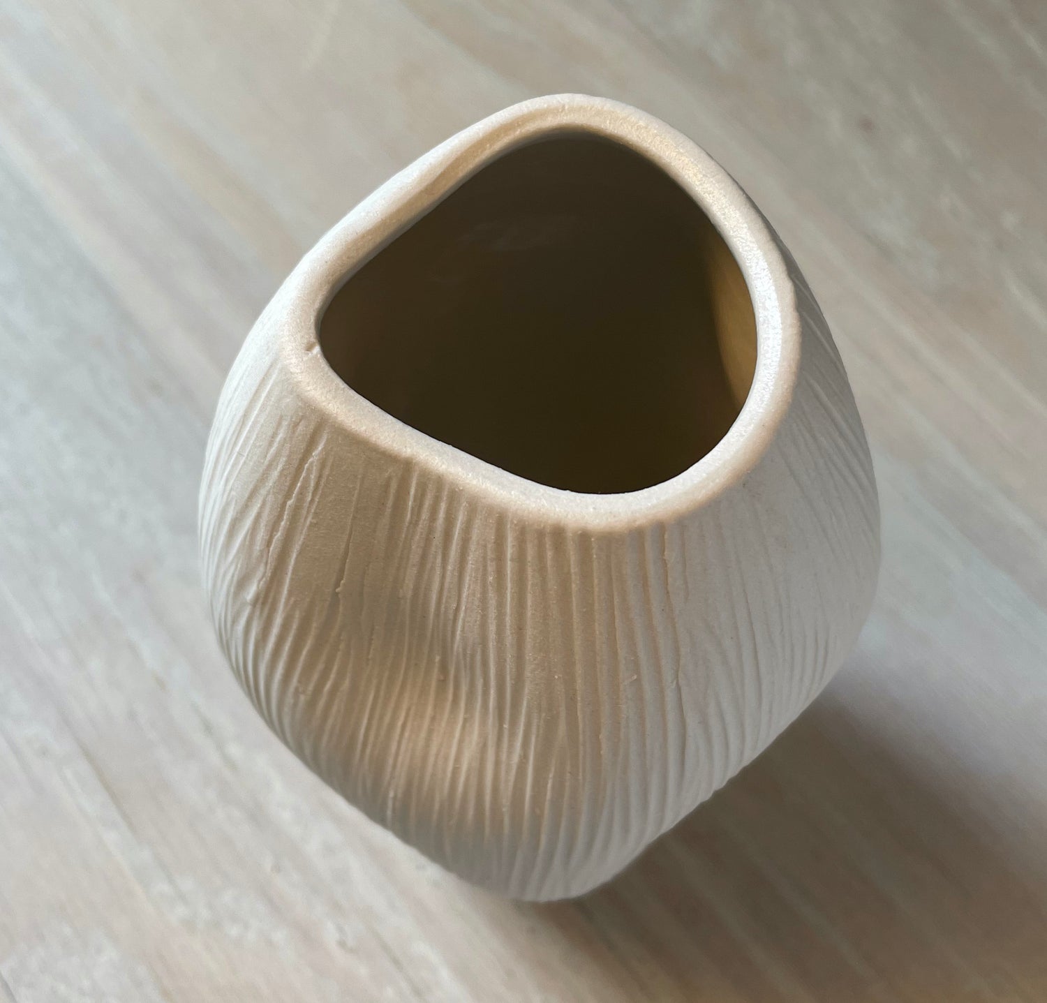 This vase is wheel-thrown from porcelain, then carved and dimpled by hand—each line carefully carved, making every piece one of a kind. The exterior is left unglazed to let porcelain clay show through, while the interior is lined with a clear, non-toxic glaze to make it fully watertight. Fired to cone 6