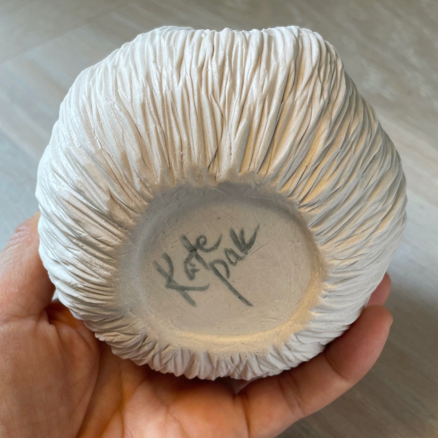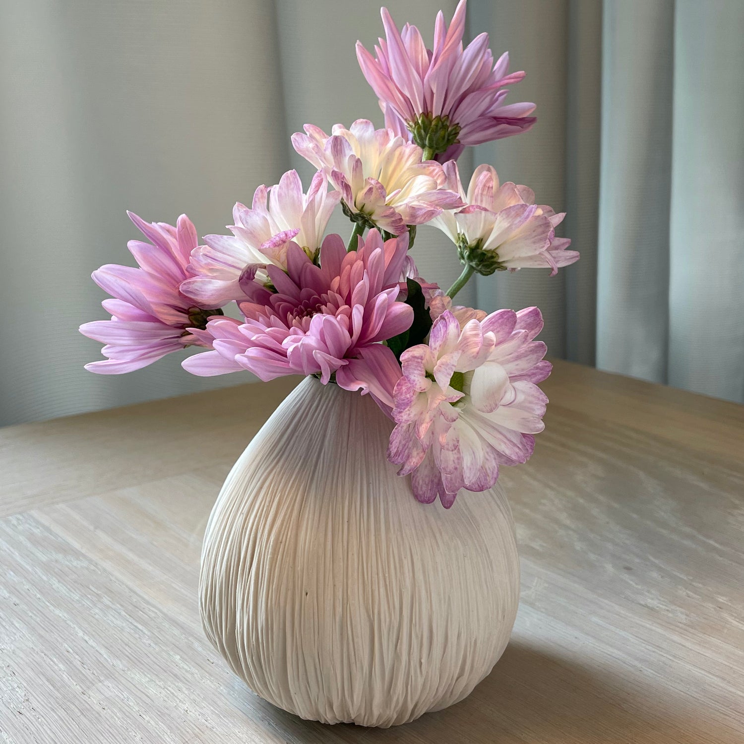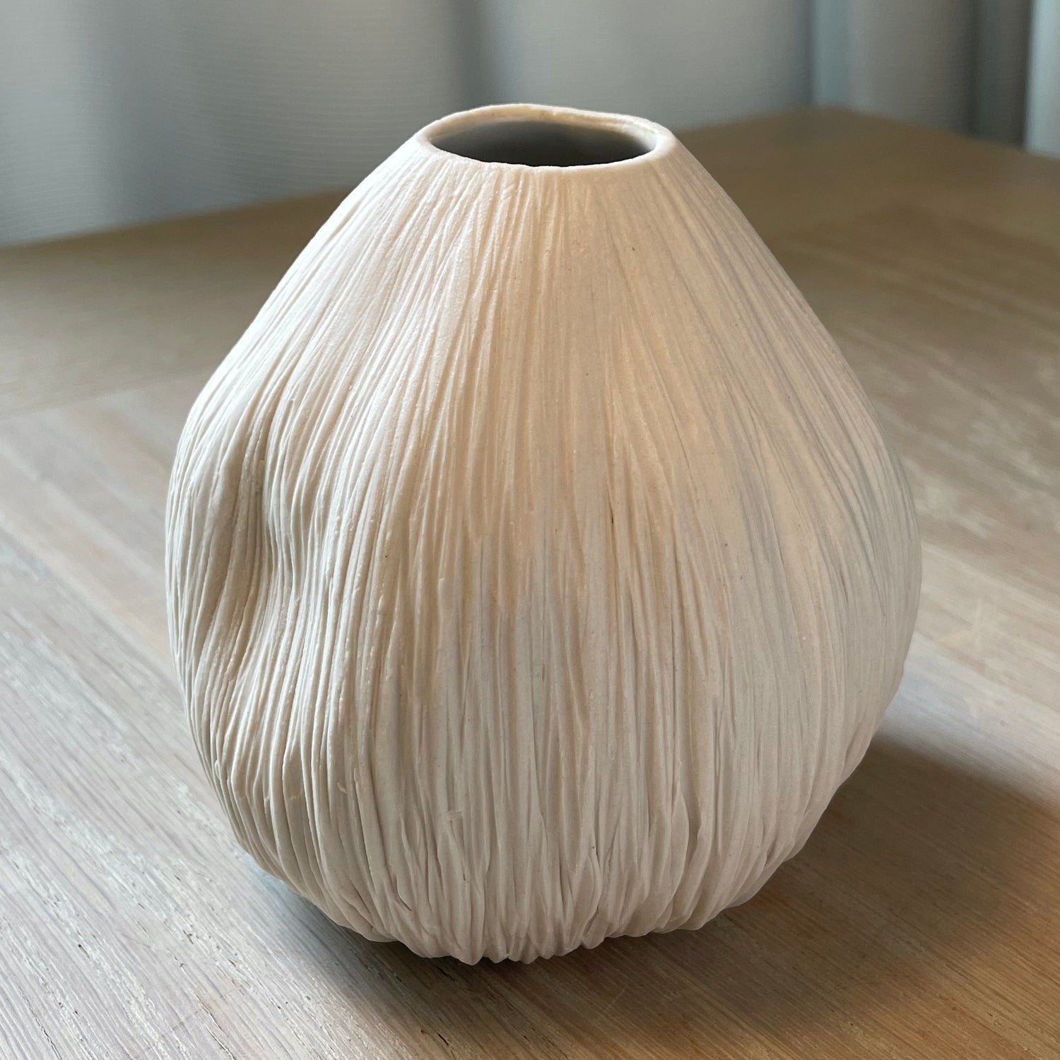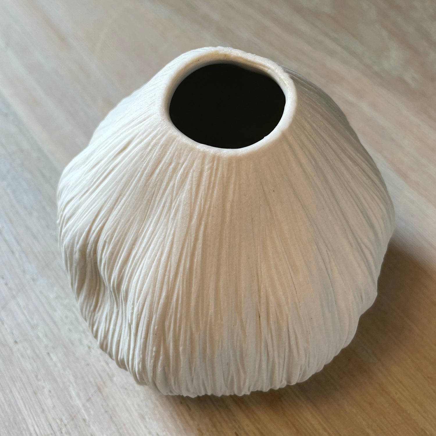 This vase is wheel-thrown from porcelain, then carved and dimpled by hand—each line carefully carved, making every piece one of a kind. The exterior is left unglazed to let porcelain clay show through, while the interior is lined with a clear, non-toxic glaze to make it fully watertight. Fired to cone 6.