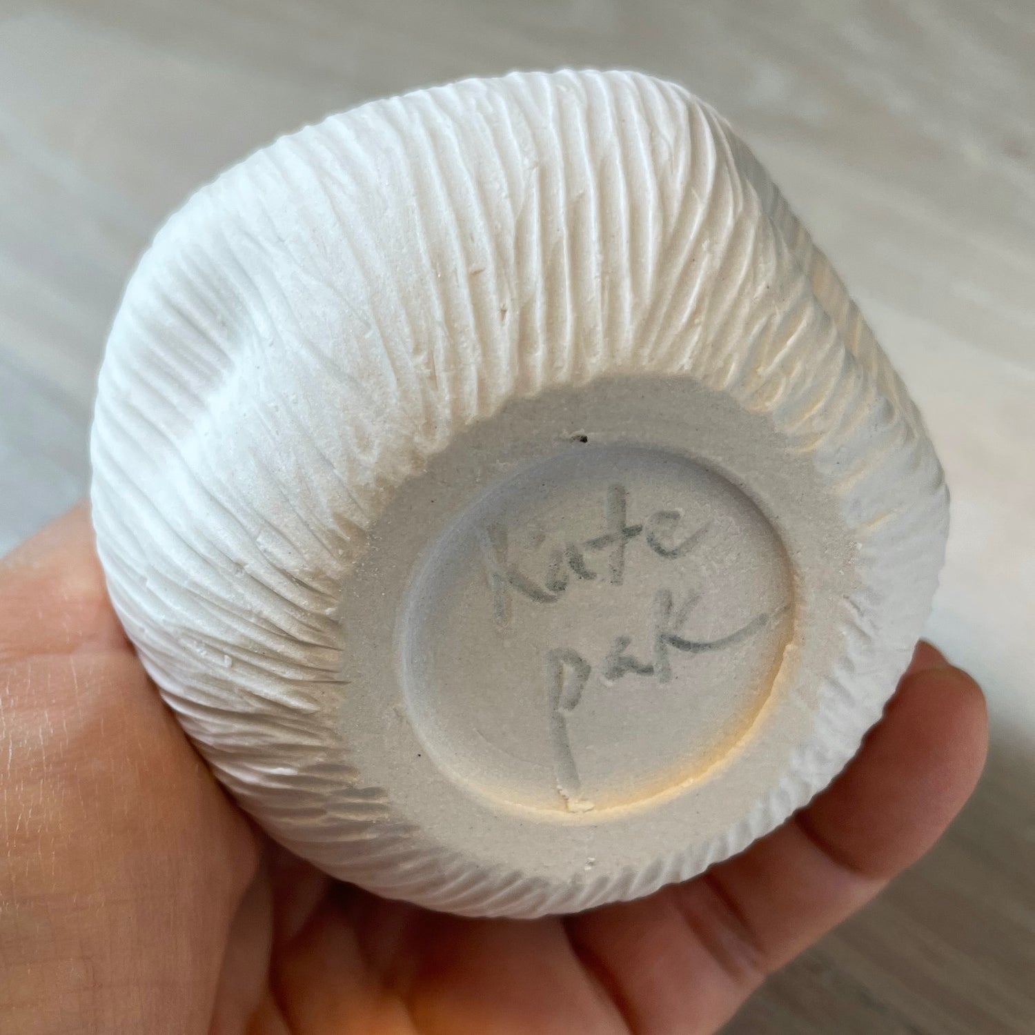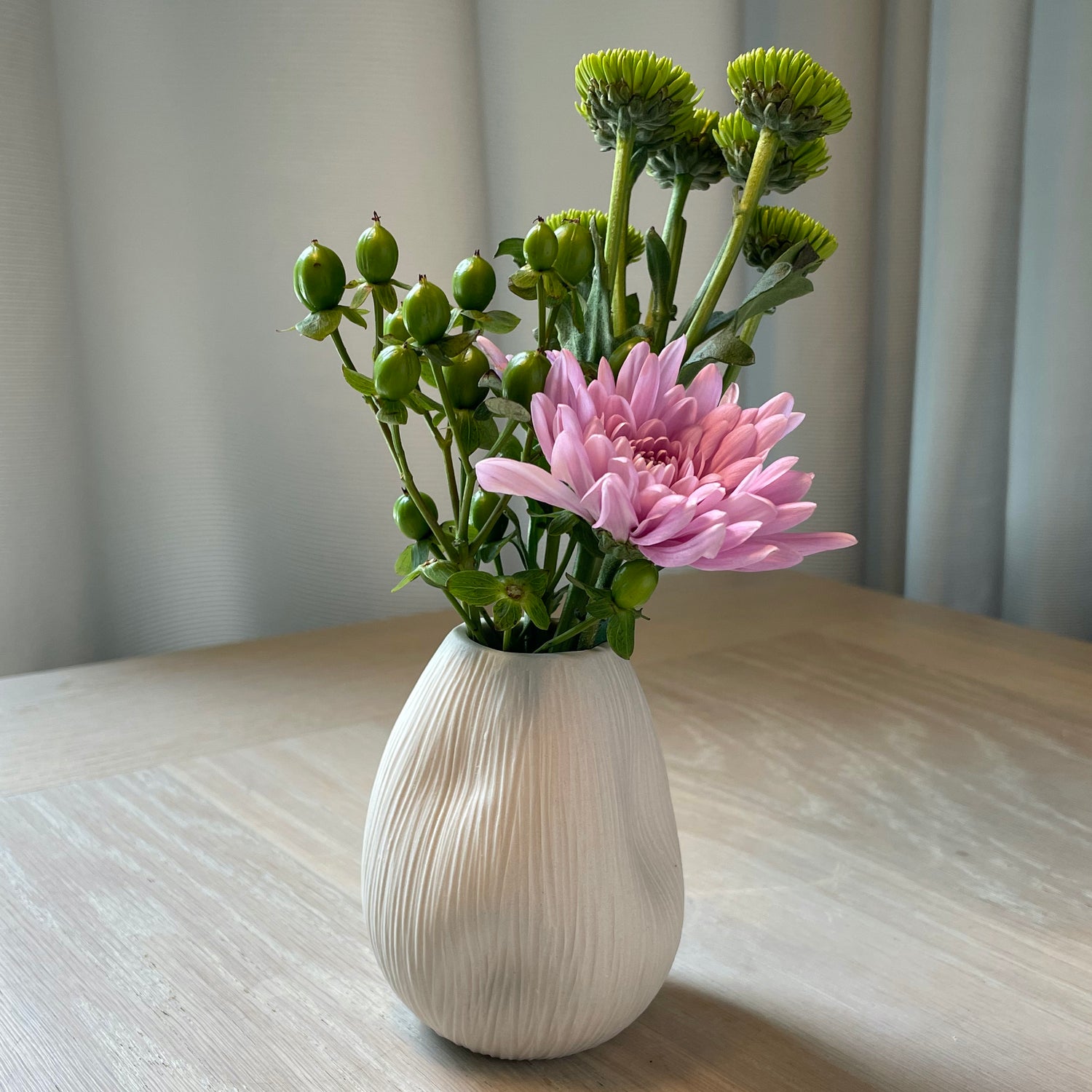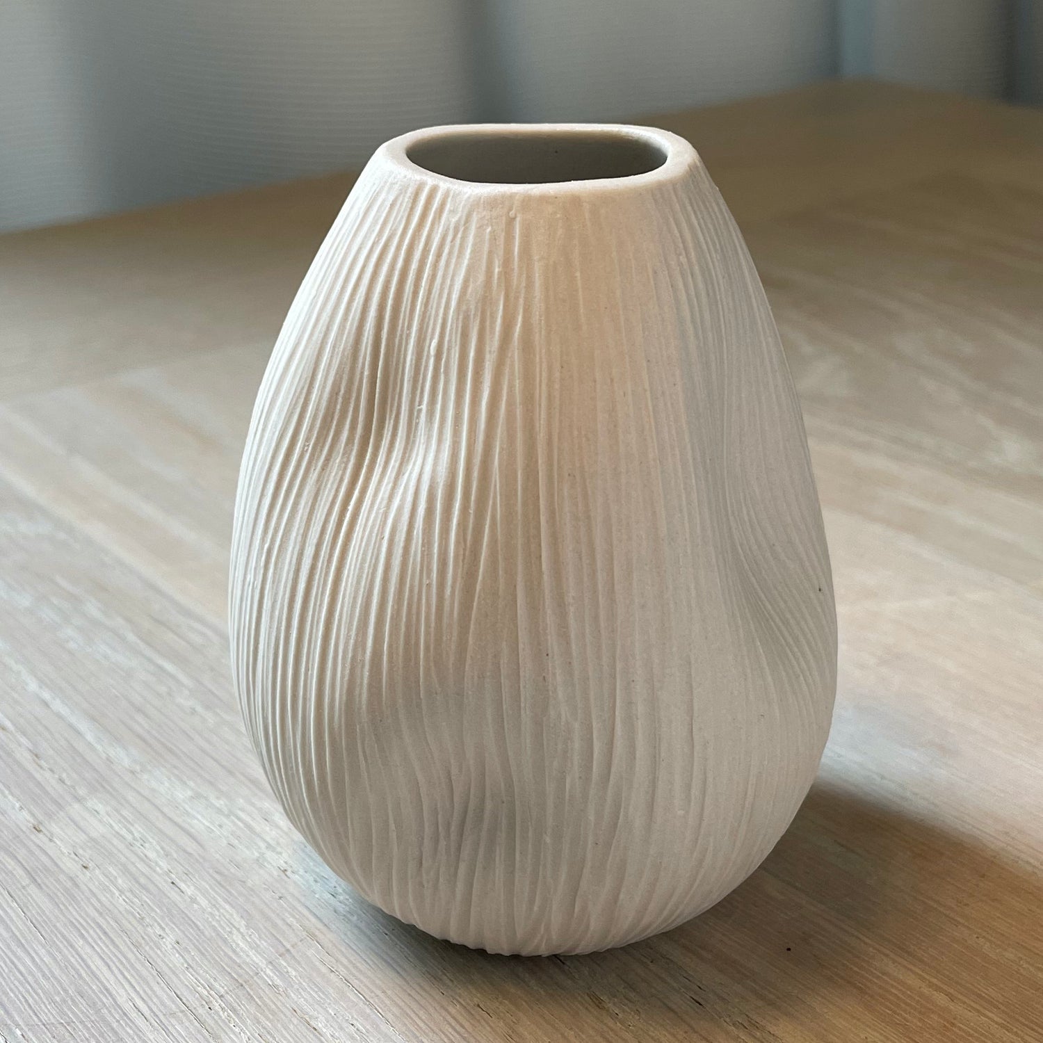 This vase is wheel-thrown from porcelain, then carved and dimpled by hand—each line carefully carved, making every piece one of a kind. The exterior is left unglazed to let porcelain clay show through, while the interior is lined with a clear, non-toxic glaze to make it fully watertight. Fired to cone 6.