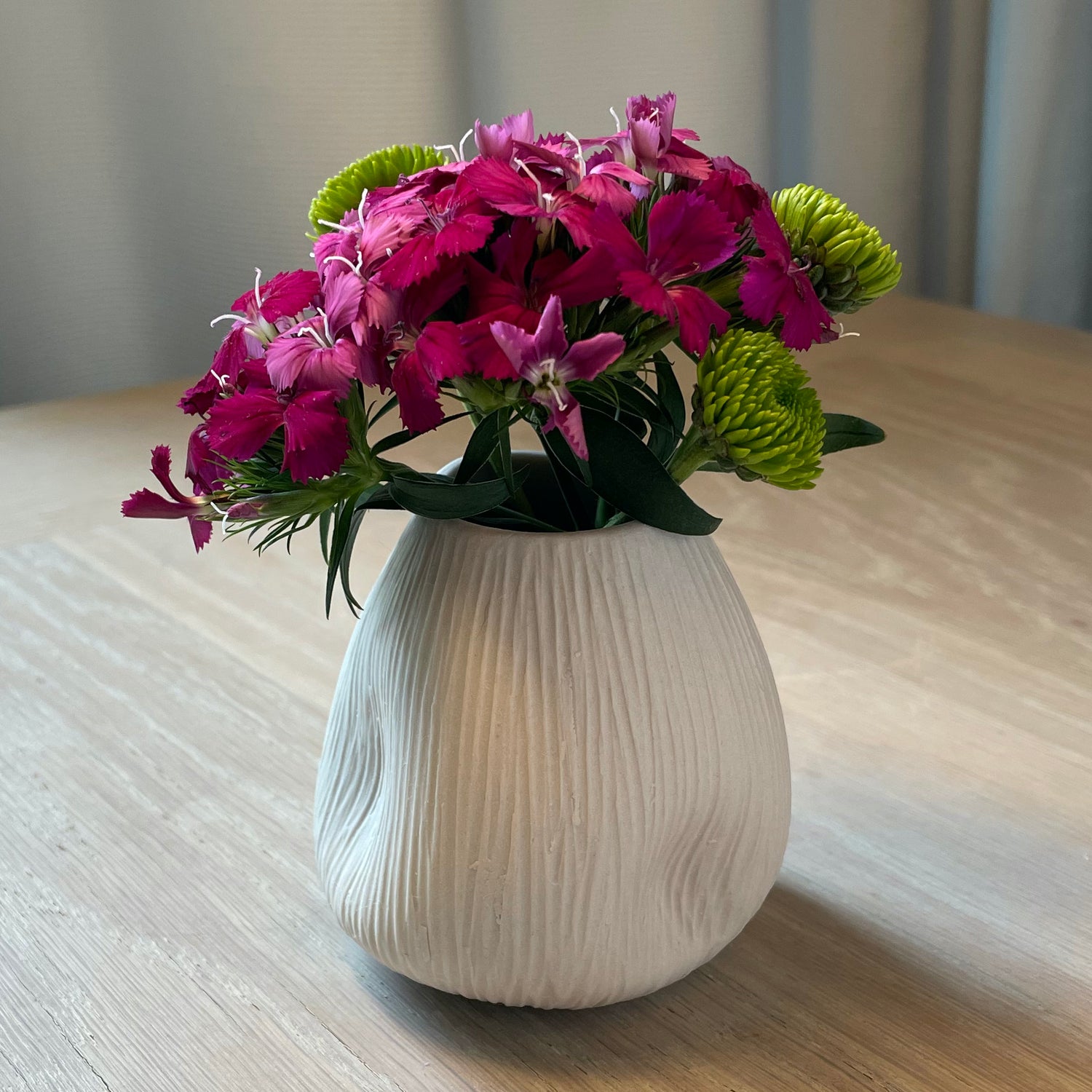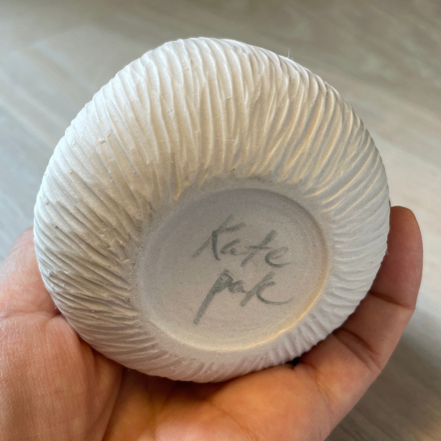 This vase is wheel-thrown from porcelain, then carved and dimpled by hand—each line carefully carved, making every piece one of a kind. The exterior is left unglazed to let porcelain clay show through, while the interior is lined with a clear, non-toxic glaze to make it fully watertight. Fired to cone 6.