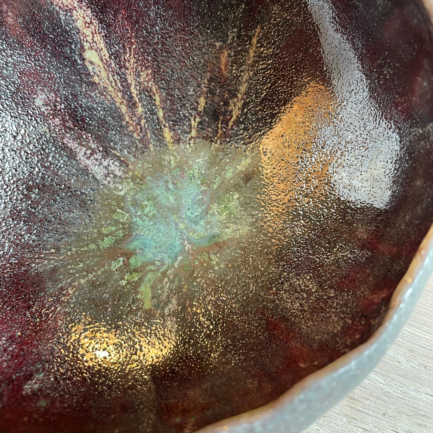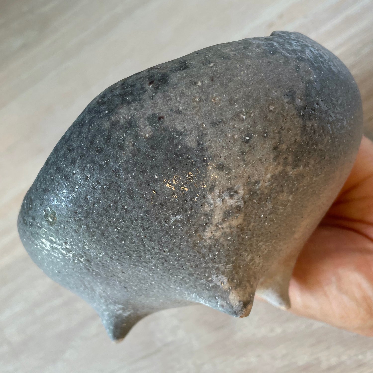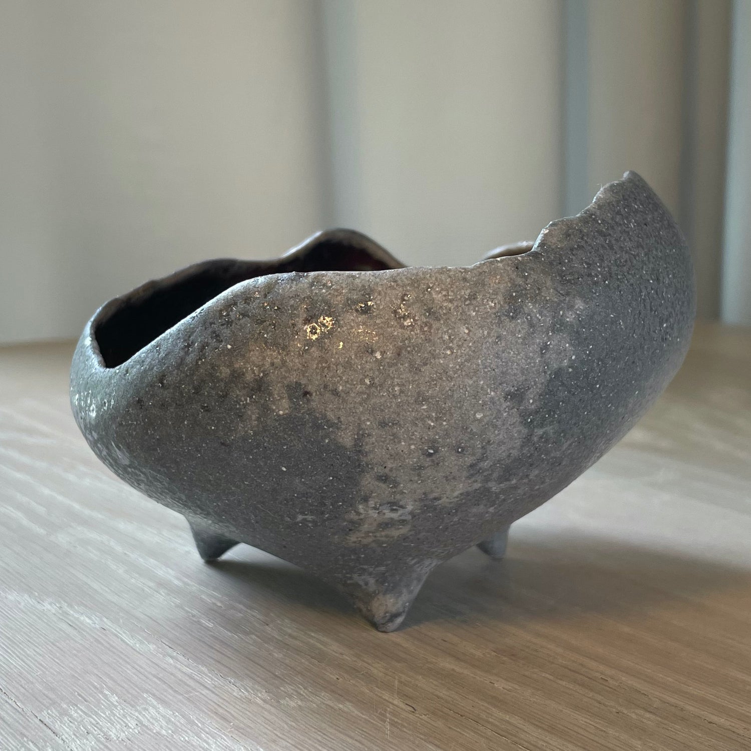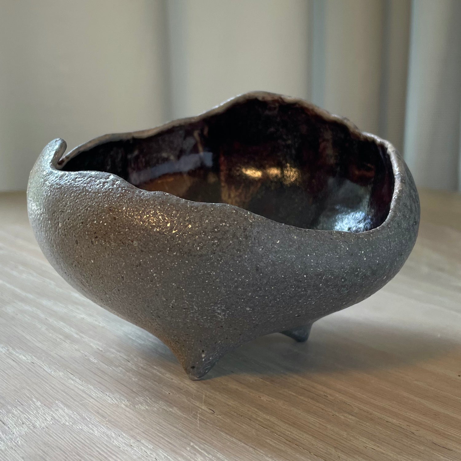 Handbuilt using the pinch technique, this bowl has an organic shape and a sculptural tripod foot. The interior is lined with layered, food-safe glazes that interact beautifully in the soda firing. The unglazed exterior captures the natural texture and color shifts from the flame.