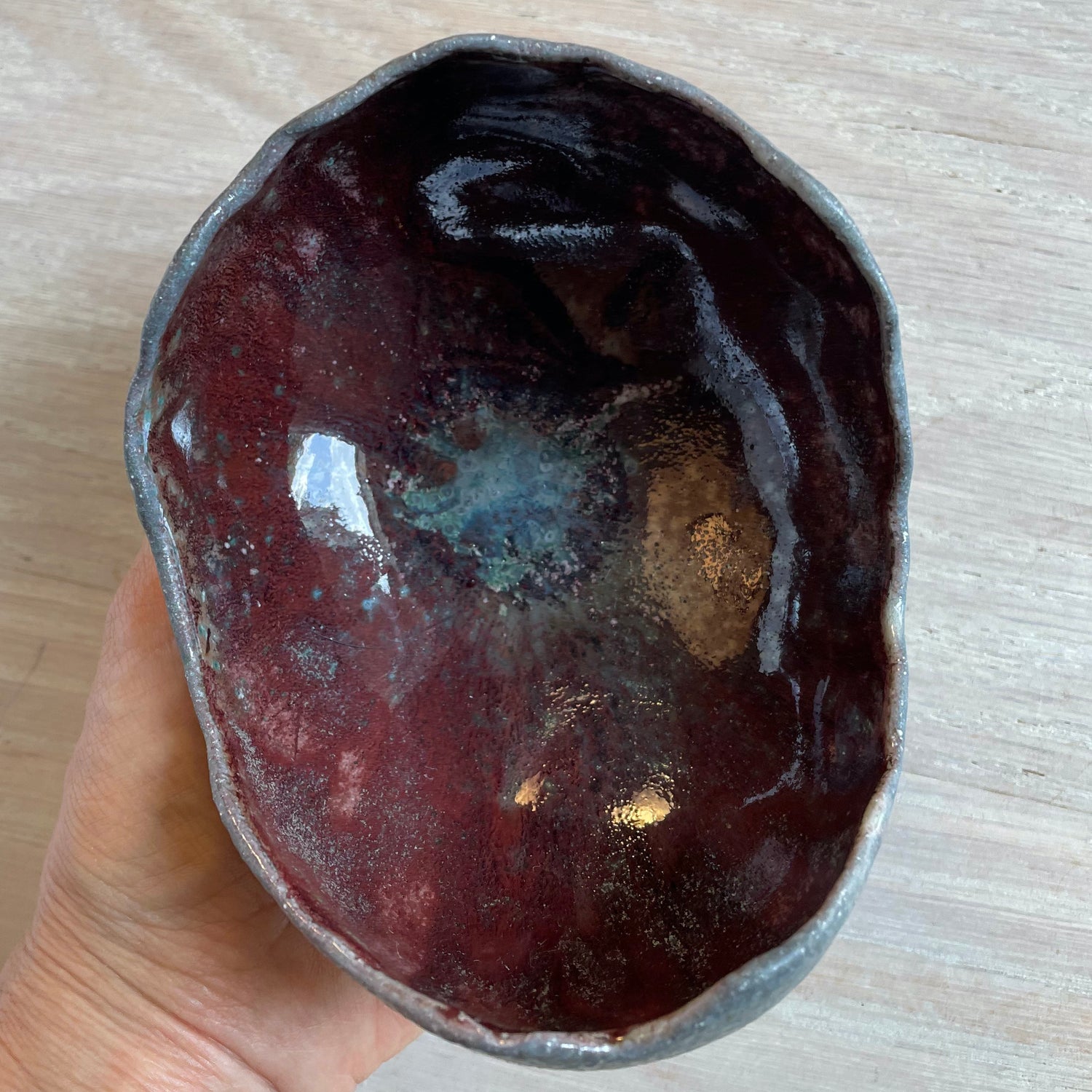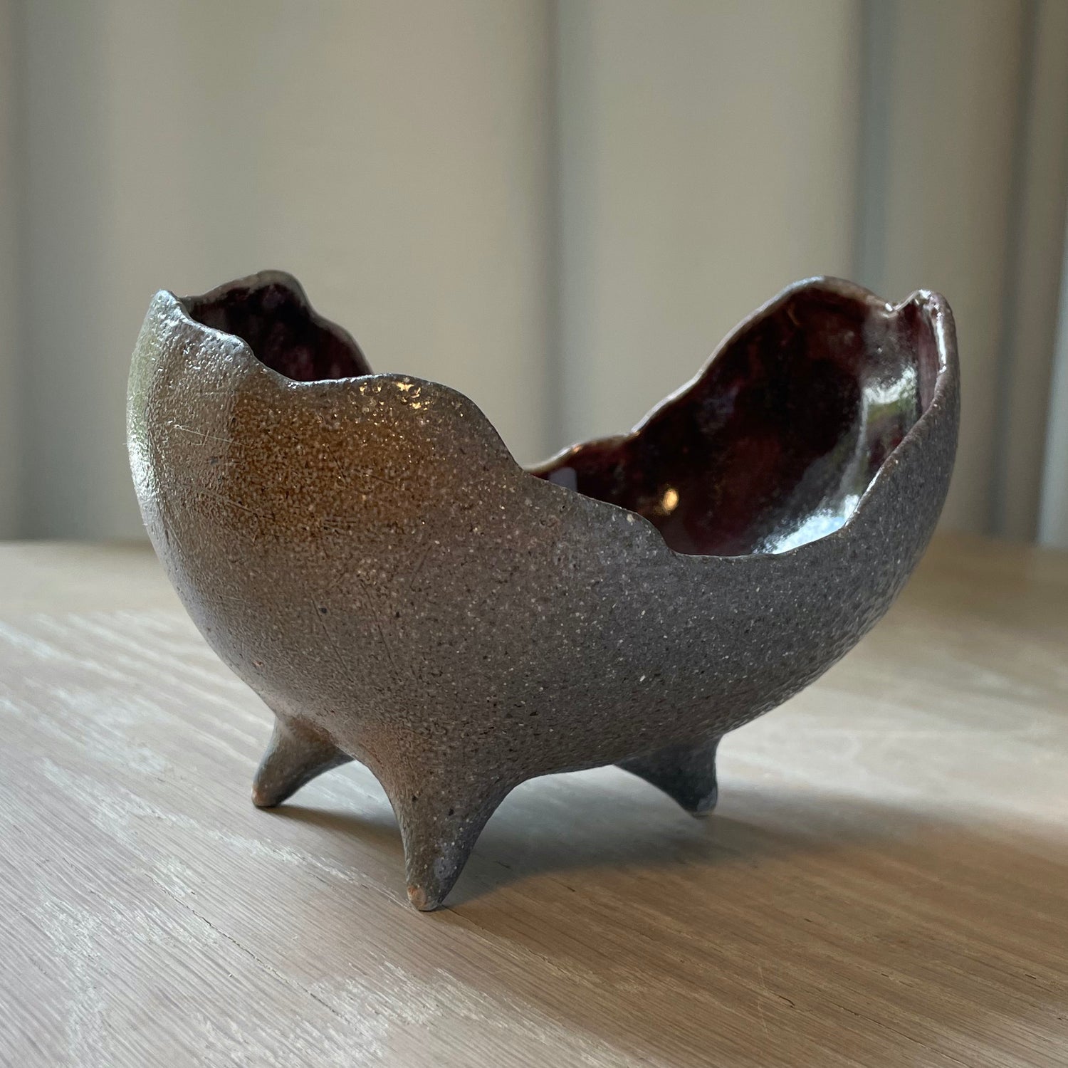 Handbuilt using the pinch technique, this bowl has an organic shape and a sculptural tripod foot. The interior is lined with layered, food-safe glazes that interact beautifully in the soda firing. The unglazed exterior captures the natural texture and color shifts from the flame.